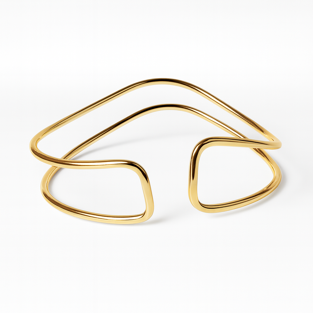 Esse bracelete tem um design moderno e minimalista, composto por duas hastes metálicas levemente torcidas, criando um efeito fluido e sofisticado. A estrutura aberta permite um ajuste confortável no pulso, tornando-o uma peça versátil para diversas ocasiões. Seu acabamento dourado transmite elegância e sofisticação, combinando perfeitamente com você.