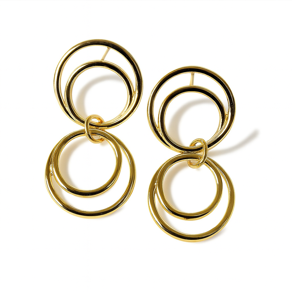 Com design moderno e sofisticado, o brinco alongado de círculos duplos é a peça perfeita para quem busca um acessório imponente e versátil. Seu formato fluido e minimalista proporciona um movimento delicado, trazendo leveza e elegância ao visual. Banho premium de ouro 18K e acabamento hipoalergênico garantem brilho duradouro e conforto para o dia a dia ou ocasiões especiais.